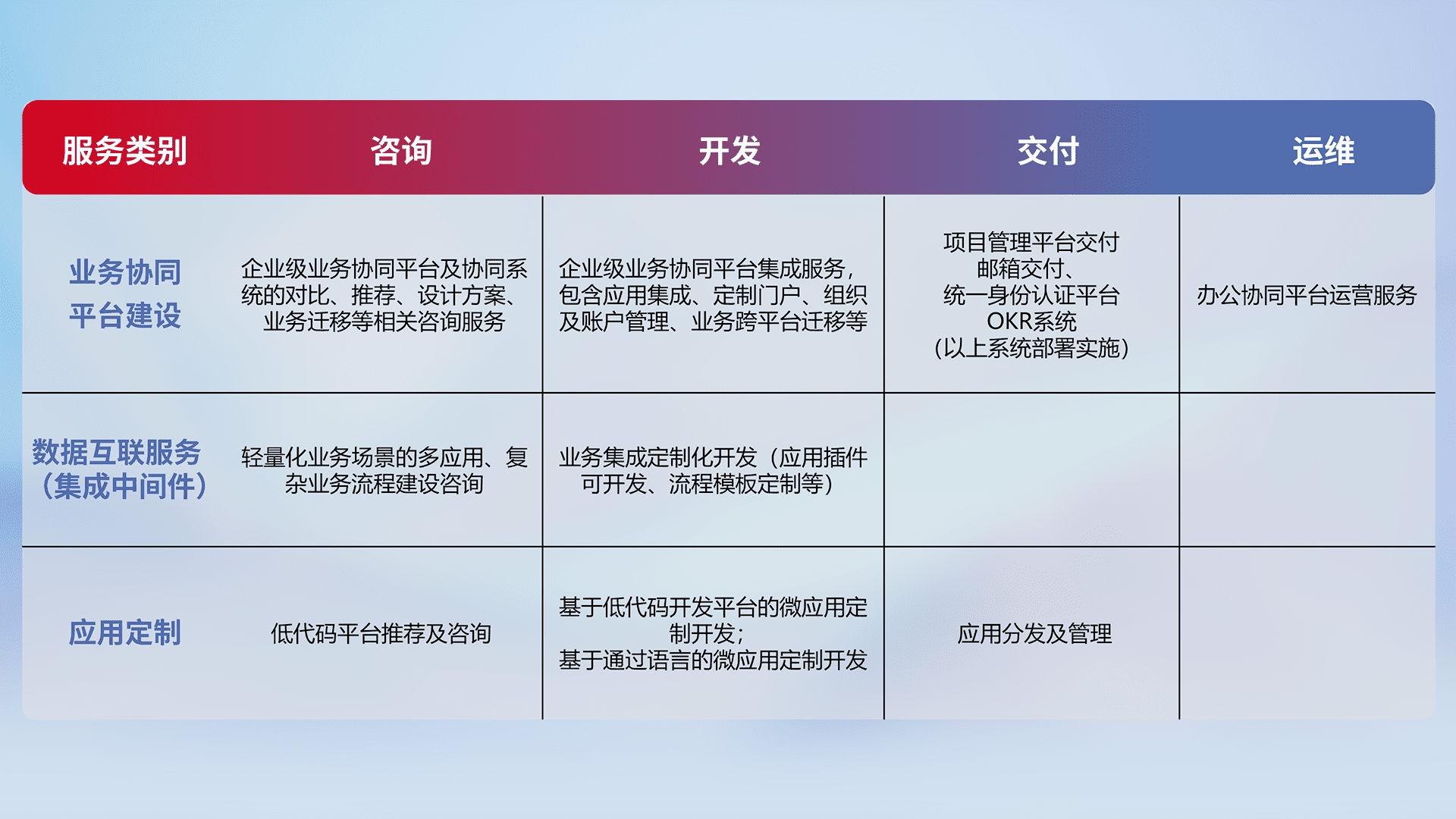 针对钉钉、、、、企微、、、IDaas等平台级产品提供产品的规划、、方案、、、交付、、、定制化开发等服务,,,,实现如统一协同办公、、智能客户服务、、、混合会议管理、、、、智能数据查询、、、、等业务场景,,,,实现数字化转型。。。。